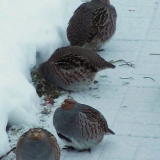 Ещё только светало, и в первые секунды я приняла их за крупных ежей, которые, пробудившись от тёплых февральских деньков, выползли на садовую дорожку в поисках еды. Потом я решила, что это неизвестные крупные птицы, но муж сказал, что это куропатки. Они двигались разом, все шестеро, выщипывая по бокам оттаявший газон, поочередно следя за обстановкой (пятеро клюют, один следит). Потом они весело побегали по насту, всё также вшестером, и под конец устроились на отдых, изобразив фрагмент французского гобелена.
